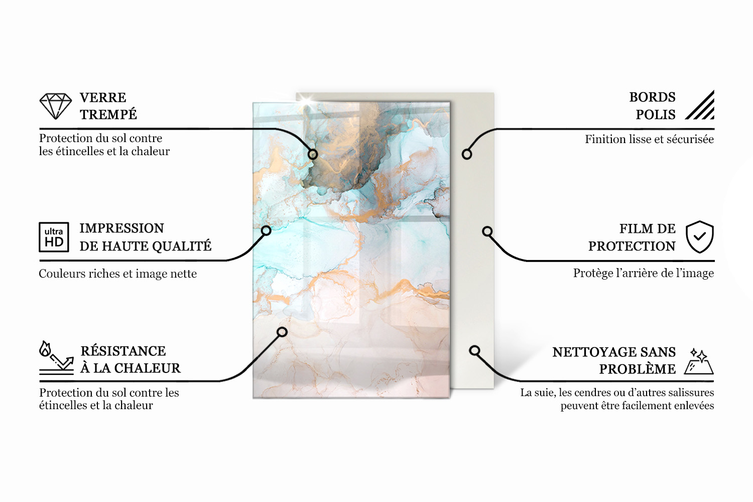 Le produit est fabriqué avec le souci du détail. Une impression de haute qualité, des bords lisses et des patins en silicone sont la garantie de votre satisfaction. En tant que plaque protection sol devant cheminée en verre, elle isole parfaitement le sol de la chaleur et de la saleté. Vous pouvez la maintenir propre très facilement, en utilisant simplement un chiffon doux.